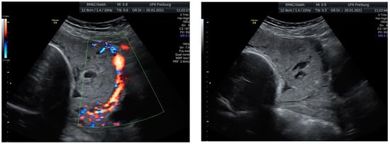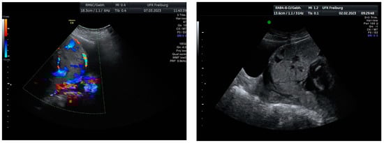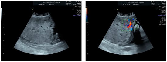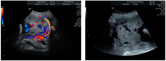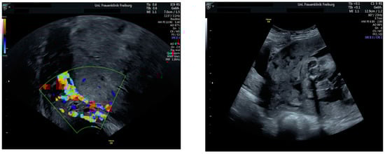 The placenta was adherent to the right-side wall. After manual dissection, an open uterine wall defect of more than 5 cm was found at the fundus. This was closed with multiple single-button sutures. The patient received Sulproston and tranexamic acid in case of increased bleeding. Postoperatively, the patient presented with anemia of 6.4 g/dL and was started on RBC concentrate and Iron (III) sodium D-gluconate complex intravenously. This resulted in an adequate increase in Hb. The puerperium was uneventful. Postpartum sonography showed that the kidneys were not obstructed bilaterally and the uterine cavity was linear. The wounds were dry and without irritation.