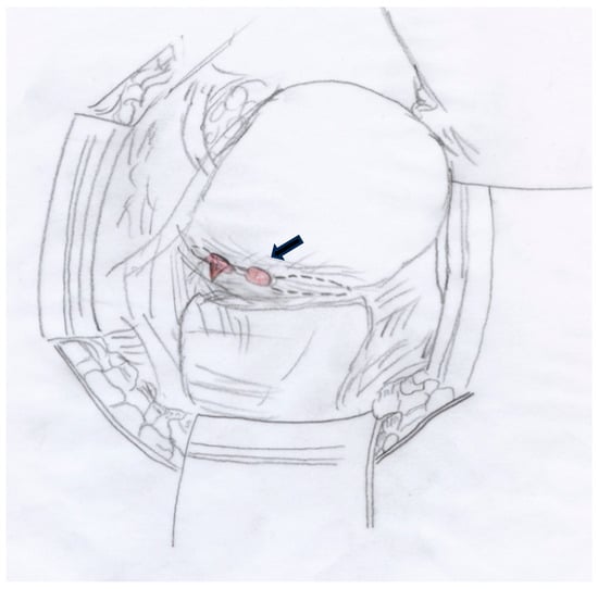 Schematic drawing illustrating the small uterine rupture with a portion of placental tissue protruding from the rupture site, which was the source of bleeding.