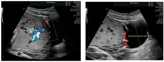 According to the standardized description of the European Working Group on Abnormally Invasive Placenta for ultrasound anomalies, the following anomalies may be seen: Loss of the “clear zone”—partially more in the middle (N/3):