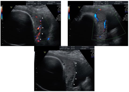 - Uterovesical hypervascularization: Significantly increased color Doppler signal between the myometrium and the posterior bladder wall. Numerous branching vascular bundles with multidirectional flow pattern and aliasing artifact.