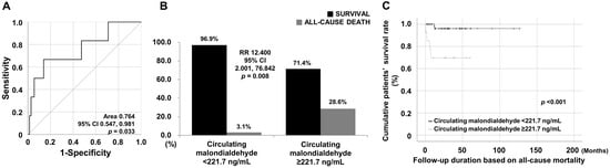Using the ROC curve analysis, the cut-off of cMDA for all-cause mortality was determined to be 221.7 ng/mL (sensitivity and specificity were 66.7% and 86.1%, respectively) (AUC 0.764, 95% confidence interval [CI] 0.547, 0.981) (Figure 1A). All-cause mortality occurred more frequently in patients with cMDA ≥ 221.7 ng/mL than in those with cMDA < 221.7 ng/mL (28.6% vs. 3.1%, p = 0.008), and RR was calculated to be 12.400 (95% CI 2.001, 76.842) (Figure 1B). Additionally, patients with cMDA ≥ 221.7 ng/mL exhibited a significantly reduced cumulative patient survival rate compared to those with cMDA < 221.7 ng/mL (p < 0.001) (Figure 1C).