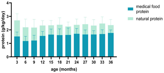 Additionally, 72% (71.8 ± 12.53) of the protein consumed by PKU patients was from medical food, while 28% (27.6 ± 11) was from natural food. The quantity of medical food (Phe-free formula until six months and amino acid-based formula after six months) was lower during the first year. Still, it increased and stabilized afterward, as shown in Figure 1.