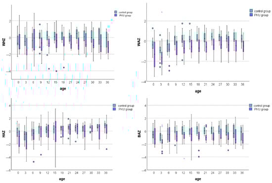 Growth measurements included weight and height from several time points (birth, the moment of diagnosis, and quarterly during the first three years) as part of the routine pediatric evaluation by the Romanian PKU guidelines. All measurements were performed by qualified health professionals, including pediatricians, dietitians, or specialized nurses, who adhered to standard procedures. Height measurements were taken using a calibrated ASTRA stadiometer with a precision of 0.1 cm, while weight measurements were obtained using a digital ASTRA weighing scale with an accuracy of 100 g. For infants up to 12 months, a manual infant scale and measuring board were used to measure recumbent length, transitioning to a manual scale and standing height measurements after that. Measurements were obtained during scheduled clinical consultations, with three measurements obtained at each visit and their average considered. Body mass index (BMI) was calculated as weight (kg)/height (m2). The child’s age, sex, weight, length, and height measurements were used to determine the following growth indicators: weight-for-age z-score (WAZ), length/height-for-age z-score (HAZ), and body mass index (BMI)-for-age z-score (BAZ). We investigated growth patterns in relation to the intake of protein and energy during the first three years of life. This period was chosen because previous studies had shown that this was the period in which the growth restriction was most evident [30]. BAZ values below −2 or between +1 and +2 were considered underweight and overweight, respectively, while values between −2 and +1 were considered normal weight. HAZ values below −2 or above +2 were classified as short stature and tall stature, respectively, while values between −2 and +2 were regarded as normal stature [38].