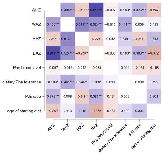 Correlation analysis between growth, Phe blood levels, and dietary parameters in PKU patients. Significance levels were *** p < 0.001, ** p < 0.01, and * p < 0.05. The color gradient in the figure indicates the level of significance, where darker shades denote stronger associations and lighter shades indicate relatively lower statistical significance.