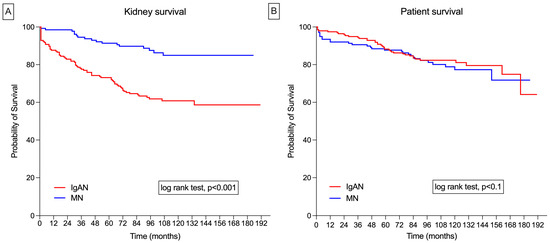 (A) Nonadjusted Kaplan–Meier survival curves for IgA nephropathy (IgAN) and membranous nephropathy (MN) for kidney survival; (B) nonadjusted Kaplan–Meier survival curves for IgAN and MN for patient survival.