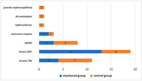 The age (p = 0.9531) and gender (p = 0.7677) structures of both groups were not significantly different. The patients forming the control group had an overall shorter time after KT compared to the intervention group (p = 0.0002). The mean interval from KT was 15.8 +- 9 months, thus meeting the inclusion criterion (3 months from KT). We did not observe a difference in the daily dose of prednisone or in the use of basiliximab in the induction protocol between the two groups. Vitamin D levels were significantly lower in the control group at the beginning of the follow-up, but this disparity leveled out during the follow-up, and we did not notice it at 6 months. The hemoglobin level was also significantly lower at the beginning, but on average it was in the zone of very mild anemia and thus met the inclusion criterion. In addition, it was saturated during follow-up, and these differences leveled off. Differences in glucose metabolism were also observed. In the intervention group, the fasting plasma glucose levels were significantly lower at baseline (p = 0.0045), 3 months (p = 0.0016), and 6 months (p = 0.0003). However, the higher baseline glycemia in the control group was within the normo-glycemic range and did not represent a pathological condition. We primarily recorded the magnesium levels, but since all the study participants were taking magnesium replacement, their levels were within the physiological range, and there was no difference between the groups. Figure 1 shows the file distribution based on the underlying cause of renal failure. Chronic glomerulonephritis and chronic tubulointerstitial nephritis accounted for the majority.