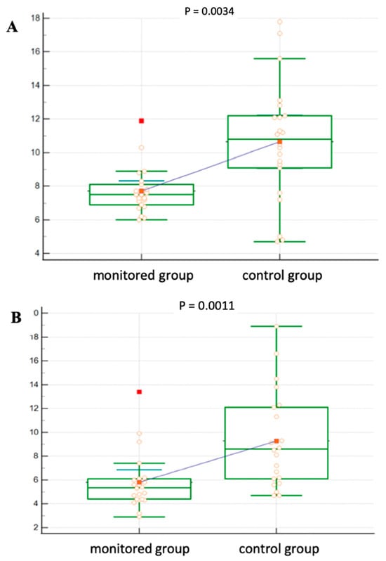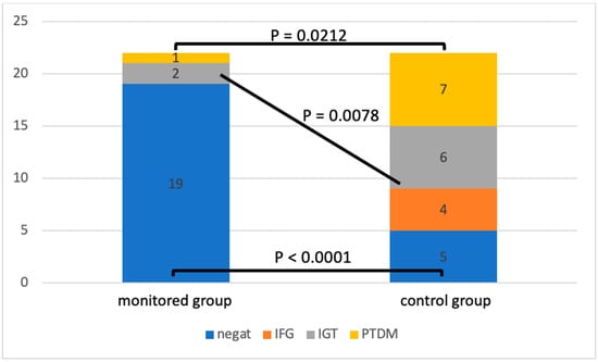The patients in the control group had significantly fewer physiological oGTT results compared to the intervention group (p < 0.0001). In the control group, we also identified a significantly higher incidence of pre-diabetic conditions: impaired glucose tolerance, fasting hyperglycemia (p = 0.0078), and diagnosed PTDM (p = 0.0212). Figure 3 shows a more detailed analysis of oGTT in both groups. In the control group, the blood glucose level was significantly higher at 30 min of the test (p = 0.0034) as well as after 120 min (p = 0.0011) compared to the intervention group.
