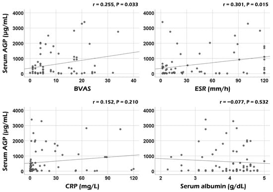 Correlation analyses of serum AGP with BVAS and acute-phase reactants. Serum AGP was significantly correlated with BVAS and ESR but not with CRP or serum albumin. AGP: alpha-1-acid glycoprotein; BVAS: Birmingham vasculitis activity score; ESR: erythrocyte sedimentation rate; CRP: C-reactive protein.