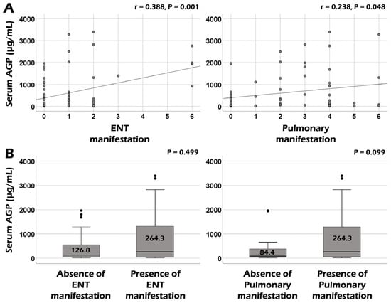 Serum AGP was significantly correlated with the BVAS (r = 0.255, p = 0.033) and ESR (r = 0.031, p = 0.015) at AAV diagnosis. However, no significant correlation was observed between serum AGP and CRP or serum albumin (Figure 1). Additionally, among the nine systemic items of the BVAS, serum AGP showed significant correlations with the sum scores of both ear–nose–throat (ENT) and pulmonary manifestations (r = 0.388, p = 0.001, and r = 0.238, p = 0.048, respectively) (Figure 2A). However, when comparing serum AGP according to the presence of ENT or pulmonary manifestation, no significant differences were observed in the serum AGP between the two groups (Figure 2B).
