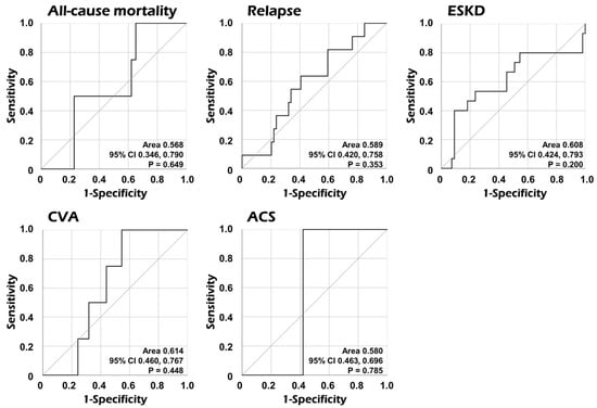Considering previous studies regarding the predictive potential of serum AGP for all-cause mortality and inflammatory risk factors for mortality in patients with AAV [,,], we speculated that serum AGP may predict poor AAV outcomes. Firstly, in the ROC curve analysis of serum AGP for all-cause mortality, relapse, ESKD, CVA, and ACS, we found no statistical significance in AUC (Figure 3). Additionally, we examined the association between serum AGP and five poor outcomes using Cox proportional hazards analysis. However, no association of serum AGP with any poor outcome was observed (Table 2). Furthermore, although the predictive ability of serum AGP at diagnosis for ESKD occurrence during follow-up was not statistically significant, it was closer to statistical significance compared to other poor outcomes. Accordingly, using ROC curve analysis, the cut-off of serum AGP for ESKD occurrence was 1539.0 μg/mL (sensitivity 40.0%, and specificity 90.9%). In Kaplan–Meier survival analysis, patients with serum AGP ≥ 1539.0 μg/mL at AAV diagnosis exhibited a significantly reduced ESKD-free survival rate during follow-up than those with serum AGP < 1539.0 μg/mL (Figure S2). These results support the inference that serum AGP may reflect the accumulation of inflammation, which ultimately accelerates the progression to ESKD in patients with AAV, based on previous studies showing that serum AGP reflected the inflammatory burden of chronic kidney diseases [,].