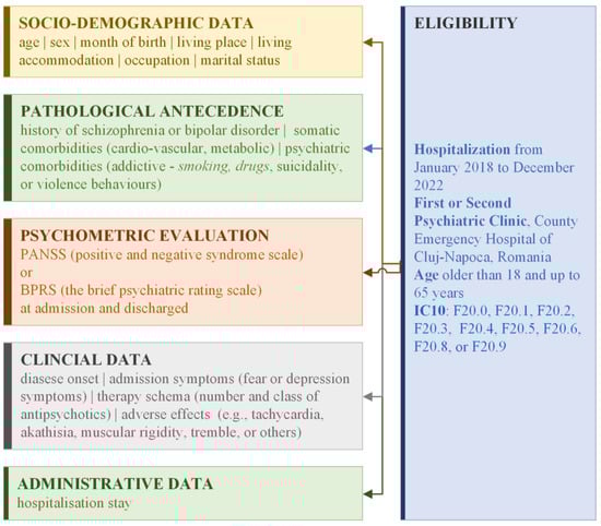 We conducted a retrospective study on patients’ medical records hospitalized during January 2018 and December 2022 at the First or Second Psychiatric Clinics of the County Emergency Hospital of Cluj-Napoca, Romania. The eligible patients were those diagnosed according to the ICD10 with paranoid schizophrenia (F20.0), hebephrenic schizophrenia (F20.1), catatonic schizophrenia (F20.2), undifferentiated schizophrenia (F20.3), post-schizophrenic depression (F20.4), residual schizophrenia (F20.5), simple schizophrenia (F20.6), other schizophrenia (F20.8), or schizophrenia, unspecified (F20.9) (Figure 1). The inclusion criteria consisted of patients with the primary diagnostic of schizophrenia, aged between 18 and 65 years, who were evaluated at both admission and discharge using either the PANSS/SCI-PANSS (structured clinical interview for the positive and negative syndrome) or BPRS (brief psychiatry rating scale) scale. Patients with diagnoses of mental retardation, bipolar disorder, schizoaffective disorder, or persistent delusional disorder were excluded. Furthermore, patients hospitalized according to the Mental Health law of lacked treatment descriptions were also excluded.