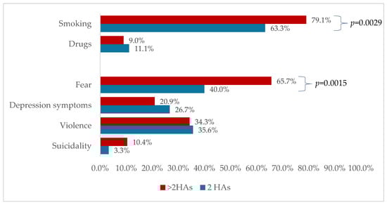 Fear as a symptom and smoking as an addiction were more frequently reported in the group with over two hospital admissions (Figure 3).