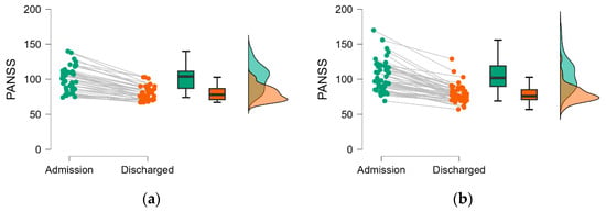 Changes in PANSS score at discharged compared to admission by hospitalization group: (a) patients with two hospital admissions; (b) patients with more than two hospital admissions. Dots are individual data, lines link the admission with the discharge, the box is constructed with the values of the 25th and 75th percentile, and the line in the box by the value of the median. The whiskers are given as the minimum and maximum.
