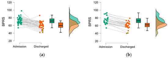 Changes in BPRS score at discharged compared to admission by hospitalization group: (a) patients with two hospital admissions; (b) patients with more than two hospital admissions. Dots are individual data, lines link the admission with the discharge, the box is constructed with the values of the 25th and 75th percentile and the line in the box by the value of the median. The whiskers are given as the minimum and maximum.