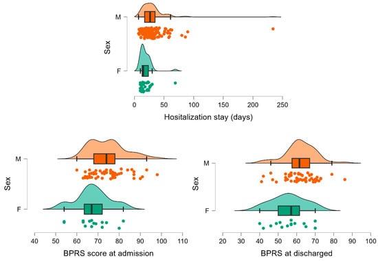 Distribution of hospitalization stay, and BPRS scores at admission and discharge by sex. Dots are individual data, lines link the admission with the discharge, the box is constructed with the values of the 25th and 75th percentile, and the line in the box by the value of the median. The whiskers are given as the minimum and maximum. M stands for male and F stands for female.