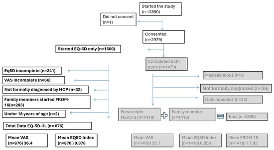 The survey was conducted from 1 December 2020 to 31 March 2021. It was started 2980 times, but one participant withdrew consent, so 2979 records were generated. After the exclusion of duplicates, 1479 records were fully completed by both patients and family members/partners, and 1418 of these were included in the previously published final analysis. Overall, 1500 participants with ME/CFS started the EQ-5D, 1259 people with ME/CFS completed the EQ-5D survey, and 66 of these participants did not complete the global questionnaire of the EQ-5D (VAS) and were excluded from the analysis. Further exclusions included 283 participants whose family members had consented to the study but had not completed the study and 32 participants who did not have a formal diagnosis. Two were under the age of 18 years and were also excluded from the analysis (see Figure 1). The data reported in this study are based on the 876 people with ME/CFS who completed the demographic and QoL survey and who did not have family members/partners complete the FROM-16.