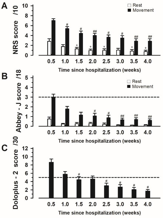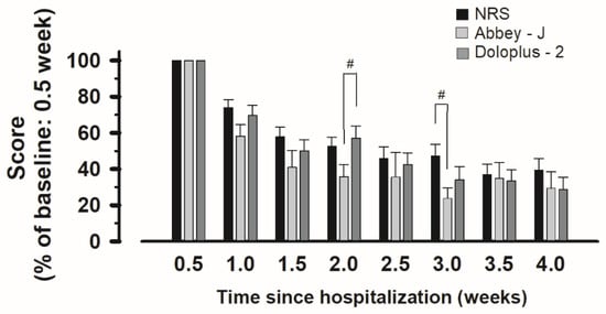 Next, we evaluated the rate of change in scores over the course of hospitalization, with pain at 0.5 weeks after admission for each score set to 100%. At 2.0 weeks and 3.0 weeks post-admission, significant differences in the change of Abbey-J scores during movement and in the NRS or Doloplus-2 scores were observed among the three groups (NRS: 52.54 ± 5.030, Abbey-J: 35.82 ± 6.750, Doloplus-2; 57.14 ± 6.66, one-way ANOVA followed by the Bonferroni, F2,92 = 3.325, p = 0.049; Abbey-J compared with Doloplus-2, p > 0.05; compared with the others at 2.0 weeks) (NRS: 47.36 ± 6.382, Abbey-J: 23.84 ± 5.700, Doloplus-2; 34.13 ± 7.24, one-way ANOVA followed by the Bonferroni, F2,71 = 3.38, p = 0.034; Abbey-J compared with NRS, p > 0.05; compared with the others at 3.0 weeks). No significant differences were observed at any other time points (one-way ANOVA at 1.0 week: F2,97 = 2.139, at 1.5 weeks: F2,97 = 1.400, at 2.5 weeks: F2,78 = 0.329, at 3.5 weeks: F2,59 = 0.060, at 4.0 weeks: F2,55 = 0.689, p > 0.05; compared with each group) (Figure 2).