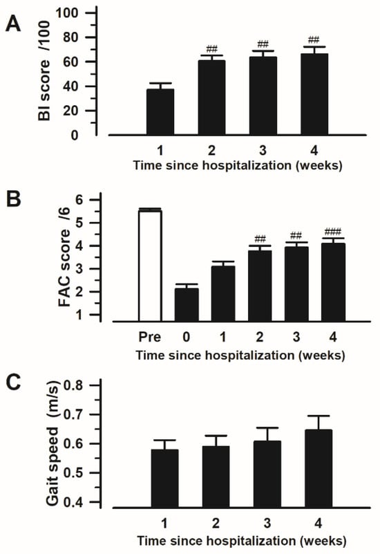Ambulatory status evaluated using the FAC significantly improved over time after admission. ADLs evaluated using the BI and 10-m walking tests were not significantly different; however, an increasing trend was observed (repeated-measures Friedman chi-squared followed by the Bonferroni test; BI: Friedman chi-squared = 46.577, df = 3, p < 0.001; and at 1.0 week vs. 2.0 weeks: p = 0.005, vs. 3.0 weeks: p = 0.003, vs. 4.0 weeks: p = 0.001 (Figure 3A). The results for the FACs were as follows: Friedman chi-squared = 53.671, df = 4, p < 0.001; and at 0.5 weeks vs. 1.0 week: p = 0.235, vs. 2.0 weeks: p = 0.022, vs. 3.0 weeks: p = 0.001, vs. 4.0 weeks: p = 0.001 (Figure 3B). For the 10-m walking test, the following results were calculated: Friedman chi-squared = 15.058, df = 3, p = 0.001; and at 1.0 week vs. 2.0 weeks: p = 0.146, vs. 3.0 weeks: p = 0.109, vs. 4.0 weeks: p = 0.055 (Figure 3C).