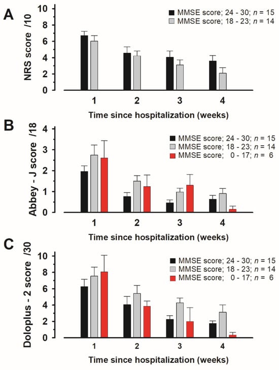 Changes in the scores for each pain assessment tool of hospitalized patients with vertebral fractures according to the degree of cognitive impairment: (A) Numerical Rating Scale (NRS); (B) Japanese version of the Abbey pain scale (Abbey-J); and (C) Doloplus-2. Abbreviations: MMSE, Mini-Mental State Examination.