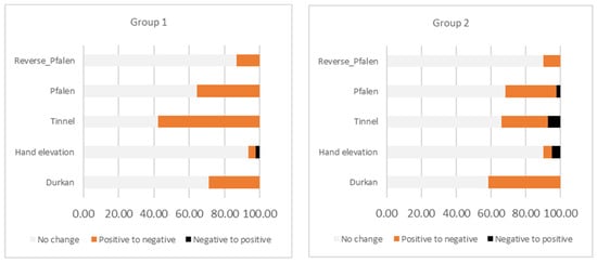 Figure 1. Notably, substantial changes (the number of transitions from a positive to a negative sign for specific symptoms by groups) were observed across all tests. However, the most significant and specific response was evident in the Phalen, Tinnel, and Durkan tests, with the regression being most pronounced in both groups. Additionally, in Group 2, three out of five tests demonstrated deterioration (reversal from negative to positive), indicating a worsening of conditions in some subjects in this group, whereas, in the ipidacrine group, this occurrence was noted in only 2.2% of cases (compared to 14.6% cumulatively for the other group).
