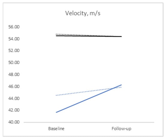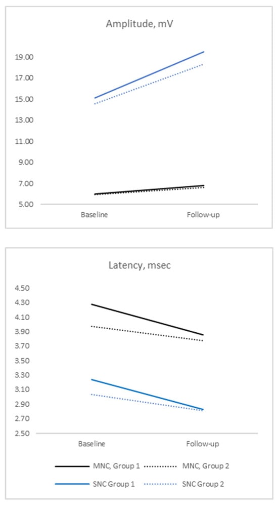 Figure 2). The conduction velocity of the motor fibers remained relatively unchanged from the baseline level in both groups and approached physiologically normal values. In contrast, impulse propagation along the sensory fibers was notably hindered at the baseline level (and worse in the Group 1), significantly increasing almost to the lower limit of normal in the ipidacrine group and remaining virtually unchanged in Group 2. The amplitude of the signal revealed a contrasting pattern, affecting more sensory fibers in both groups, while the motor indicator remained nearly unchanged. Signal latency showed a significant reduction in all groups, but only in the ipidacrine group (Group 1) did the indicators practically approach normal limits at the follow-up.