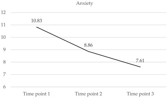 The sample presented the highest mean score for the anxiety scale (10.82; SD = 5.86) at the first time point, and for the score compatible with severe anxiety symptoms, a downward trajectory was found at the following data collection points (Table 3 and Figure 1). At the third time point (T3), HCWs presented a mean score of 7.61 (SD = 5.13), compatible with moderate anxiety symptoms. Statistically significant differences were observed between the three time points. Table 4 shows the evolution over time of anxiety levels. Moderate and severe anxiety were more prevalent at T1, whilst mild and moderate anxiety were more frequent at T3. Thus, at T1, the total number of HCWs with symptoms compatible with moderate and severe anxiety was 148 (57.6%) and with minimal and mild anxiety was 109 (42.4%), while these values appeared inverted at T3, reaching 32.7% and 67.3%, respectively.