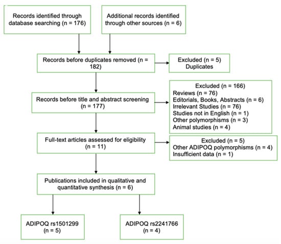 - Liu, Y.; Kanu, J.S.; Qiu, S.; Cheng, Y.; Li, R.; Kou, C.; Gu, Y.; Bai, Y.; Shi, J.; Li, Y.; et al. Associations between Three Common Single Nucleotide Polymorphisms (Rs266729, Rs2241766, and Rs1501299) of ADIPOQ and Cardiovascular Disease: A Meta-Analysis. Lipids Health Dis. 2018, 17, 126. [Google Scholar] [CrossRef]