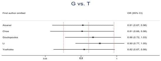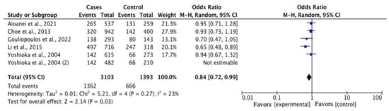 | G vs. T | Overall | 3103 | 1393 | 5 | 0.84 (0.72–0.99) | 2.14 | 0.03 | 5.21 | 0.27 | 23 | 0.01 |