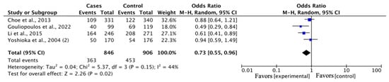 | T vs. G | Overall | 3045 | 805 | 4 | 1.30 (1.00–2.09) | 1.42 | 0.15 | 10.03 | 0.02 | 70 | 0.09 |