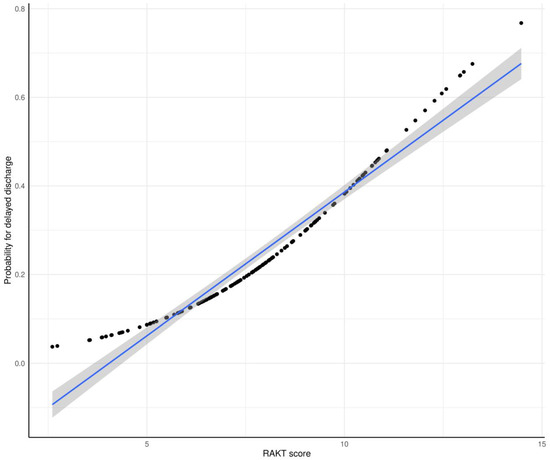 Predictive performance of the RAKT score for delayed discharge in patients undergoing robot-assisted kidney transplantation (postoperative hospital stay > 7 days). The black dots show the distribution of the actual values of the probability of delayed discharge by RAKT score. The blue solid line represents the linear regression line of this distribution, and the gray area indicates the confidence interval of the regression line. RAKT, robot-assisted kidney transplantation.