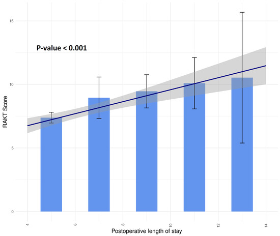 Delayed discharge probability distribution by RAKT score. The p-value indicates the significance level for the trend regression line. The blue solid line represents the trend line for the distribution of RAKT scores in relation to the postoperative length of stay, with the gray area indicating the confidence interval of this trend line. The black solid bar lines depict the confidence intervals of the corresponding RAKT score distribution for each value of postoperative length of stay. RAKT, robot-assisted kidney transplantation.