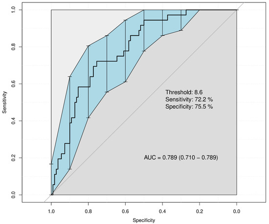 To evaluate the predictive performance of the RAKT score-based delayed discharge risk prediction model, ROC curve analysis and calibration curve evaluation were conducted. The area under the ROC curve (AUC) was 0.789 (95% CI: 0.710–0.789), indicating a strong predictive capability (Figure 3). Figure S2 illustrates the calibration of the risk prediction model, demonstrating a close alignment between predicted probabilities and actual outcomes.