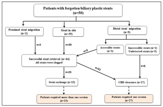 The flow chart revealed stent in situ (39 patients, 78%), distal stent migration (9 patients, 18%), and proximal stent migration (2 patients, 4%). Forty-four stents were retrieved (39 stents in situ, 3 accessible distally migrated stents, and 2 proximally migrated stents), and all of them were found to be clogged. Among these 44 patients, 23 patients had stent exchange, and 21 patients had CBD clearance. Furthermore, CBD clearance was achieved in the remaining 6 patients with distal stent migration (5 with undetected stents and 1 with an inaccessible stent) as illustrated in Figure 2.