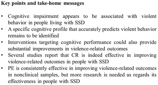 The key points and take-home messages of the review are that cognitive impairment appears to be consistently associated with violent behavior in people living with SSD, but a specific cognitive profile that accurately predicts violent behavior remains to be identified.
