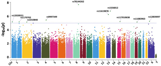 - Purcell, S.; Neale, B.; Todd-Brown, K.; Thomas, L.; Ferreira, M.A.; Bender, D.; Maller, J.; Sklar, P.; de Bakker, P.I.; Daly, M.J.; et al. PLINK: A tool set for whole-genome association and population-based linkage analyses. Am. J. Hum. Genet. 2007, 81, 559–575. [Google Scholar] [CrossRef] [PubMed]