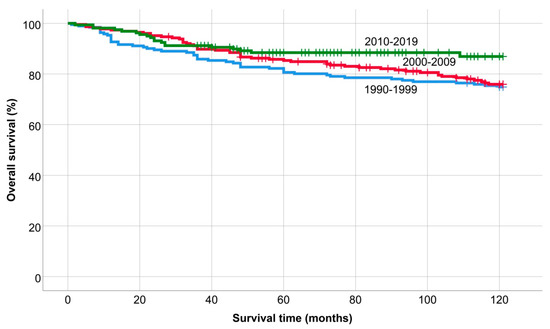 Overall survival of patients treated between 1990 and 1999, 2000 and 2009 and 2010 and 2019.