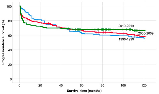 Progression-free survival of patients treated between 1990 and 1999, 2000 and 2009 and 2010 and 2019.
