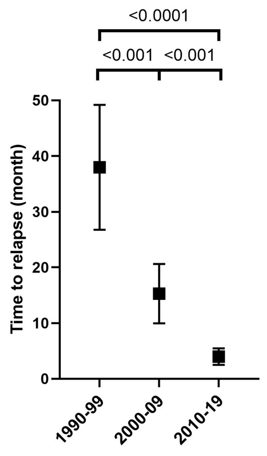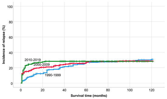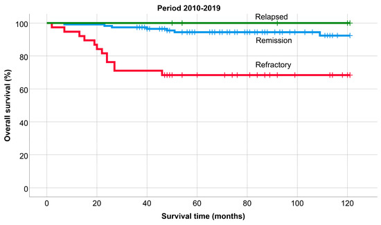 The OS of patients remaining in remission, relapsing, or being refractory was significantly different in each period (p < 0.001); 5-year: 88.8%, 85.1%, and 64.1%, and 10-year: 82.5%, 74.8%, and 59.2%. (1990–1999: 78%, 77%, and 40% (p: 0.002), 2000–2009: 81%, 67%, and 61% (p = 0.01), and 2010–2019: 92%, 100%, and 68% (p < 0.001). Similarly, the survival of patients who remained in remission was always significantly better compared to refractory patients, while there was never a significant difference between the survival of patients who remained in remission and those who relapsed (Figure 5, Figure 6 and Figure 7).