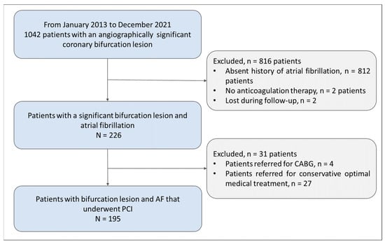 From January 2013 to December 2021, 1042, patients with angiographic bifurcation lesions were included in the Bulgarian Bifurcation prospective registry. As shown in the study flowchart (Figure 1), 816 patients were excluded, with 812 patients lacking a history of AF, and 2 patients having AF, but with no indication for anticoagulation therapy. Moreover, 2 patients were lost during follow-up. The final study population consisted of 226 patients eligible for the main analysis.
