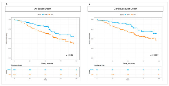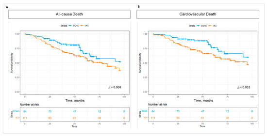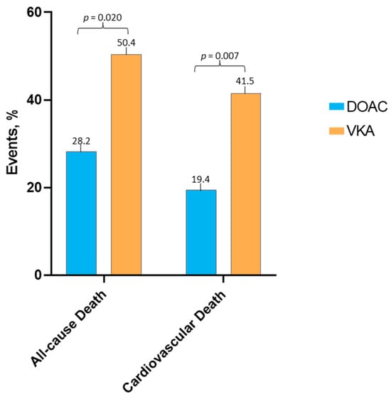 Furthermore, CV death was significantly lower in patients taking DOAC—19.4% (n = 20) versus 41.5% (n = 51) in patients on VKA, p = 0.007, (Figure 3).