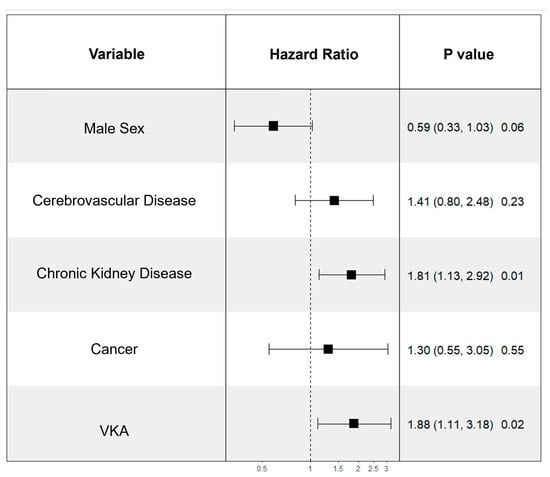 The following factors that were found significantly different between the two groups were included in multivariate Cox regression analysis to identify predictors of CV death: sex, cerebrovascular disease, chronic kidney disease, presence of cancer, and the type of anticoagulant therapy. In Cox regression analysis, VKA therapy remained an independent predictor of cardiovascular death (HR 1.88; 95% CI 1.11–3.18; p = 0.01), together with chronic kidney disease (HR 1.81; 95% CI 1.13–2.92; p = 0.01, Figure 5).