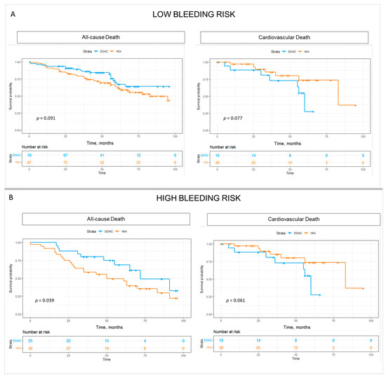 All-cause mortality for the whole low/moderate bleeding risk group was 34.5% (n = 57). Patients receiving VKA had significantly higher rates of all-cause death 41.5% (n = 51) versus 19.4% (n = 20) of patients on DOAC, p = 0.091. Cardiovascular mortality in the low/moderate bleeding risk group was 26% (n = 43) in total. Rates of cardiovascular death were numerically higher in the VKA group with 35.6% (n = 31) versus 15.4% (n = 12) in patients on VKA, p = 0.77, Figure 6A.