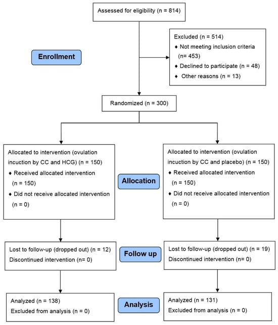 Thabet M, Abdelhafez MS, Elshamy MR, Albahlol IA, Fayala E, Wageeh A, El-Zayadi AA, Bahgat NA, Mohammed SM, Mohamed AA, et al. Competence of Combined Low Dose of Human Chorionic Gonadotropin (HCG) and Clomiphene Citrate (CC) Versus Continued CC during Ovulation Induction in Women with CC-Resistant Polycystic Ovarian Syndrome: A Randomized Controlled Trial. Medicina. 2024; 60(8):1300. https://doi.org/10.3390/medicina60081300