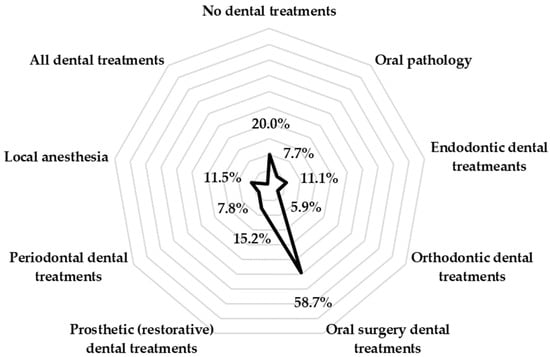 Figure 1 shows which dental procedures patients fear the most, with multiple answers possible. More than half of the respondents (58.7%) stated that oral surgery causes them the greatest anxiety (n = 911). Conversely, a significantly lower percentage of respondents stated that orthodontic procedures (5.9% of them) and oral medicine procedures (7.7%) cause them the most anxiety.