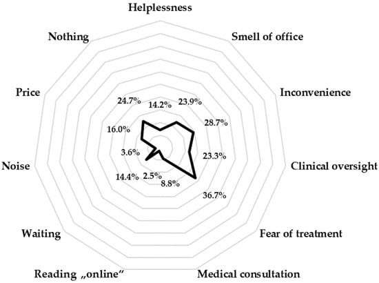 Various factors can play a role in the development of dental anxiety, with the exact causes varying from person to person. Patients treated in departments that specialise in non-invasive procedures (that do not require local anaesthesia or dental drilling) may be less likely to suffer from dental anxiety. Conversely, patients undergoing surgical and restorative procedures may find them uncomfortable and intimidating []. In our study, 58.7% of patients stated that oral surgery was the dental procedure that scared them the most, while just over one-tenth of the respondents identified local anaesthesia as the most frightening procedure. Similarities can be found with studies conducted in the United Arab Emirates [], India [], and Pakistan []. However, a study conducted on the adult population in India [] showed that the type of dental procedure had no influence on the occurrence of major dental anxiety.