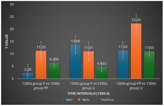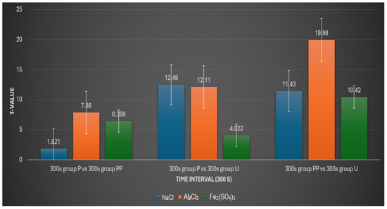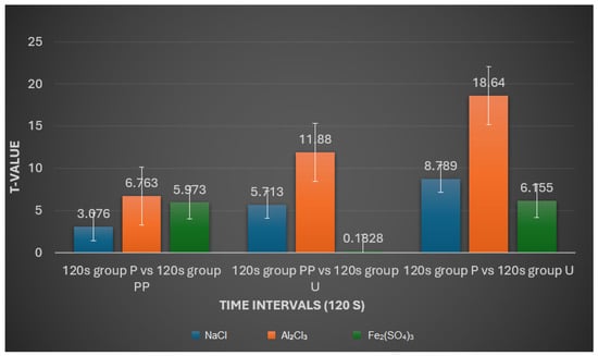 In the Fe2(SO4)3 solution, all comparisons showed significant differences (p < 0.05), with P vs. PP and PP vs. U showing highly significant differences (p < 0.001). This indicates that by 300 s, even the comparison between groups P and U showed significant changes, albeit to a lesser degree compared to the other two comparisons (Figure 6).