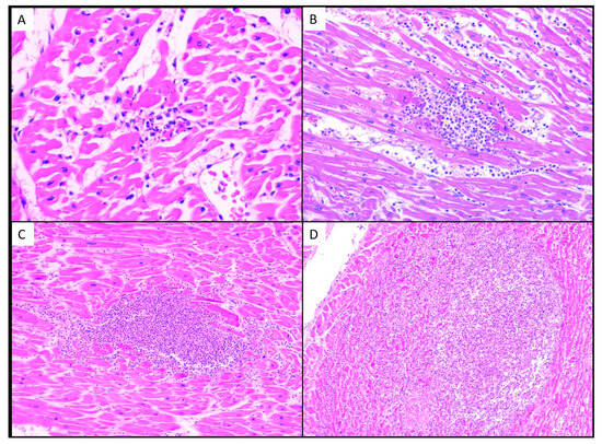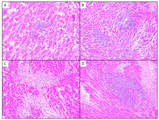 Myocardial inflammation displaying grade 1: inflammation occupies <10% of the section—Image (A), HE, 200×; grade 2: several inflammation foci occupying 10–20% of the section—Image (B), HE, 100×; grade 3: broader, branching inflammatory foci representing 20–30% of the section—Image (C), HE, 100×; grade 4: severe inflammation extending in at least 30% of the cardiac section—Image (D), HE, 50×.