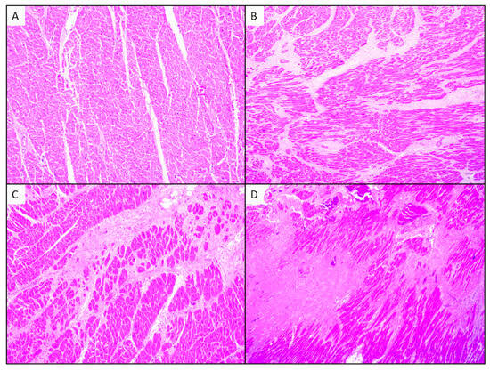 Myocardial necrosis: grade 1: individual necrotic cells necrosis—Image (A), HE, 200×; grade 2: small group of necrotic cells—Image (B), HE, 100×; grade 3: well-delineated necrotic area—image (C), HE, 100×; grade 4: expanding infarct-like necrosis—Image (D), HE, 50×.
