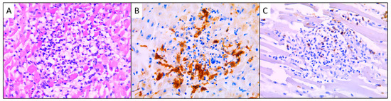 Myocarditis focus. (A): nodular aggregate of inflammatory cells with central myocyte necrosis (moderate necrosis—grade 2), HE, 200×; (B): macrophage-rich inflammation highlighted by CD163 expression in approximately 55% of inflammatory cells, IHC, 200×; (C): rare lymphocytes positive for CD3 in approximately 10% of inflammatory cells, IHC, 200×.