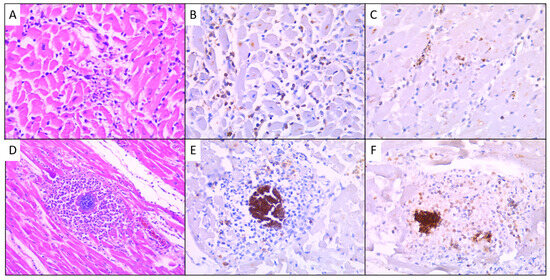 To enhance the accuracy of histological examination, immunohistochemistry was employed to better delineate the population of inflammatory cells and their distribution within cardiac tissue inflammation. According to the current literature, the most prevalent cells identified are T lymphocytes, characterized by CD3 expression, and macrophages, identified through CD163 staining [42,43]. Additionally, neutrophils were included in this study due to their significance within the post-mortem context of myocarditis. A comprehensive review of the forensic pathology literature indicates that myocarditis cases with neutrophil- and macrophage-rich polymorphous infiltrates suggest an infectious, primarily bacterial cause [44]. These observations are supported by the physiological innate immune response, which employs phagocytosis, cytokine release, and complement activation to eliminate these microorganisms, even in the absence of a specific antibody-mediated response. In our study, cases with severe inflammation, predominantly neutrophilic, and necrosis were frequently associated with bacterial or fungal myocarditis, confirmed by tissue section analysis or cardiac blood testing (p = 0.038).